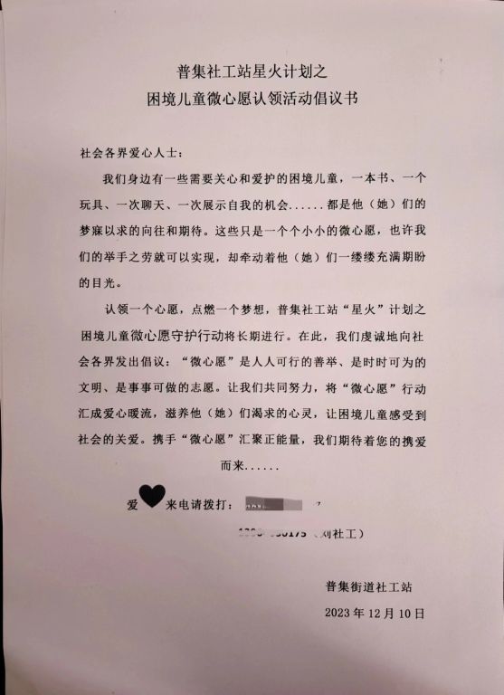 为了让这些困境儿童的心愿得以实现,普集社工站采取了一系列有力的措施,利用微信社交平台和线下宣传单发放两种方式,将项目的信息传递给社会大众,让更多的人了解到困境儿童的需求,激发他们的同情心和关爱之情。同时社工积极链接政府和社会各界爱心人士资源,向他们详细介绍项目的具体情况,鼓励社会各界力量参与到这个项目中,共同为困境儿童贡献力量。