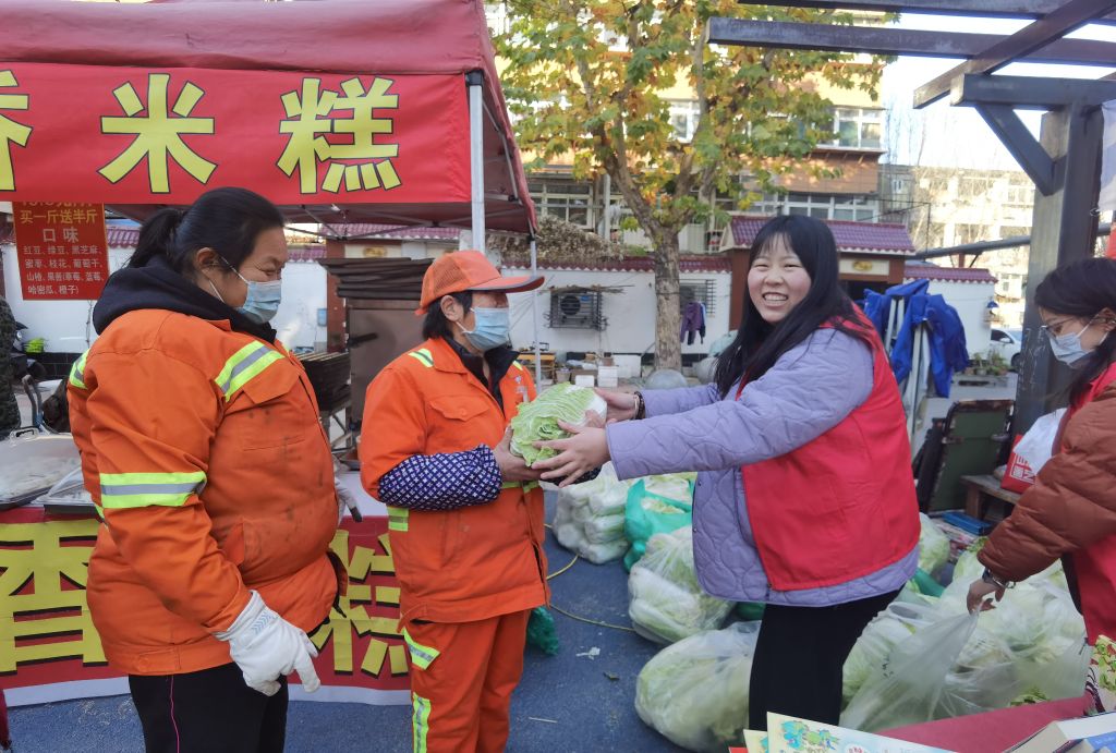 环卫工人是城市的美容师,冬日寒冷的天气使得他们的工作更加困难。北村街道社工站关注辖区环卫工人需求,将服务关怀融入细节,为环卫工人等特殊群体也送上一份爱心白菜。“感谢社工伙伴们,有了你们的关心,我们干活都更有劲了。”环卫工人环抱着翠绿的白菜这样说道。