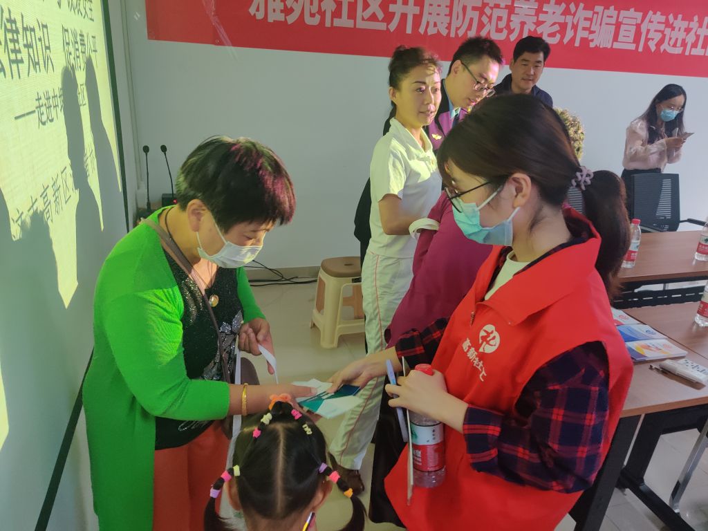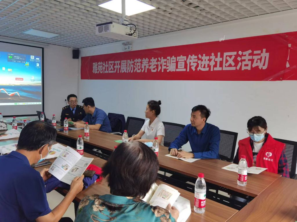 为进一步推进打击整治养老诈骗专项行动,高新区发展保障部、财政金融部、市场监管部三部门走进中垠雅苑社区,联合开展“防范养老诈骗宣传进社区”宣讲活动,高新区社工总站共同参与此次活动。