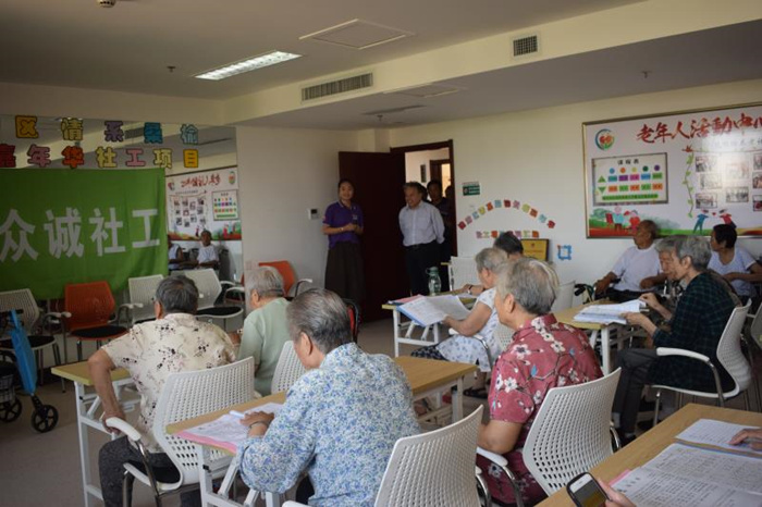 赵蓬奇副会长一行在项目组社工的引导下参观了悦银铃养老社工项目组的工作。首先是参观了“麻友之家”棋牌小组活动,此小组在社工的引导下已经成为自组织;随后参观了“乐享枫音”老年合唱小组,一曲《夕阳红》让大家感受到了老年人特有的情怀和精神;最后参观了“翰墨轩”书法兴趣小组,并赞美老人书法苍劲有力,棱角分明。