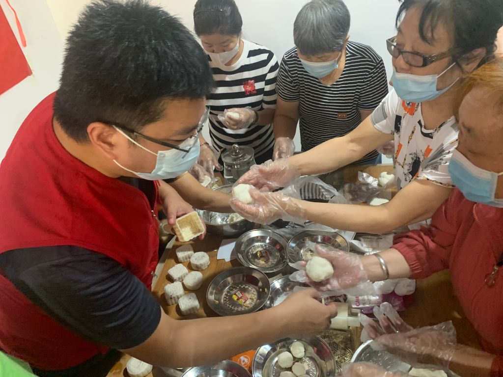 活动现场的居民和志愿者们很快便领会了制作窍门,大家围在一起有说有笑做月饼,互相分享着自己的经验,有的揉冰皮、包馅,有的压模、分装,现场分工明确、配合默契,还有志愿者高兴的唱起歌来,好不热闹。随着活动的进行,一个个独具特色的冰皮月饼相继制作完成,大家一边品尝月饼,一边说中秋节的趣事,营造出浓厚的节日氛围。