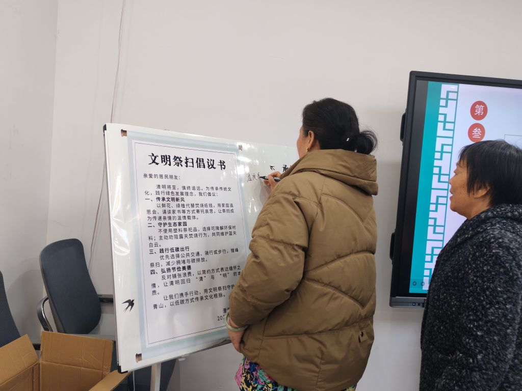活动伊始,驻站社工为现场居民详细讲解了清明节的由来、习俗,以及防火防灾、文明祭扫等知识。通过实际案例,社工深入浅出地阐述了移风易俗的重要意义,引导居民树立绿色、文明的祭祀观念。随后,在文明祭扫倡议书旁,居民们纷纷签名,表达了对绿色祭祀、文明祭祀的支持。
