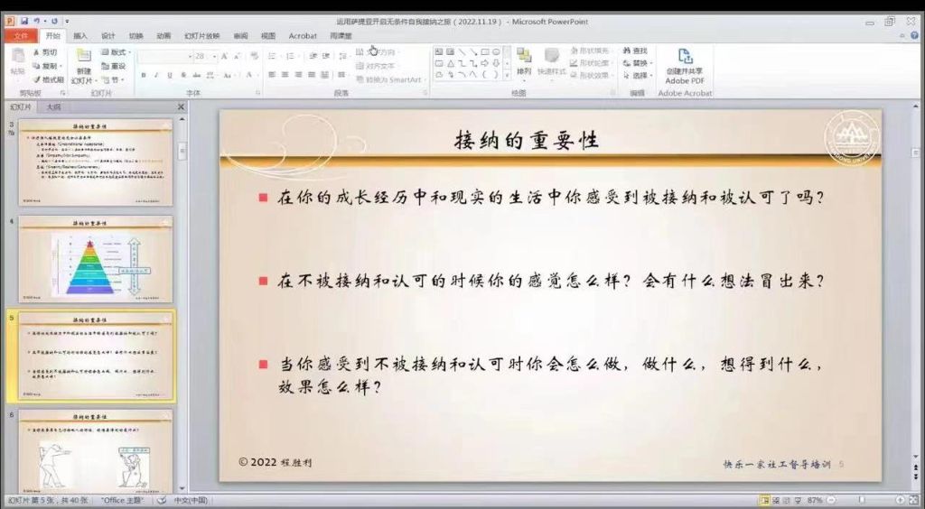 萨提亚模式又称萨提亚沟通模式,是由美国首位家庭治疗专家维琴尼亚·萨提亚(Virginia Satir)女士所创建的理论体系,萨提亚模式,又叫联合家庭治疗。萨提亚建立的心理治疗方法,最大特点是着重提高个人的自尊、改善沟通及帮助人活得更“人性化”而不只求消除“症状”,治疗的最终目标是个人达致“身心整合,内外一致”。程教授以萨提亚模式为背景,向各位社工讲解了自我探索、冰山理论、沟通模式、生存模型等相关理论知识。结合参与社工的实际案例通过层层剥笋的方式,一步步引导大家分析社工在工作中的心路历程。