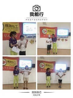 在本次的活动中,社工先以解说的形式,与青少年真诚对话,启发他们寻找独特的自己,了解真实的自我,以发展的眼光去发现自己的优点。同时,社工鼓励青少年以“我开始喜欢我自己,是因为……”为引子,进行小组内的分享、交流,引导青少年正向的态度,真诚的喜欢自己。在分享与反馈的时间里,青少年分享喜欢自己,是因为自己曾被鼓励、被肯定,发现了在他人眼中不一样的自己,从而开始喜欢自己。