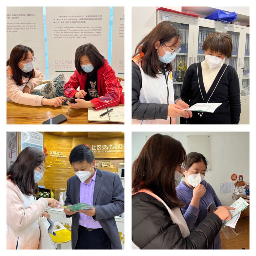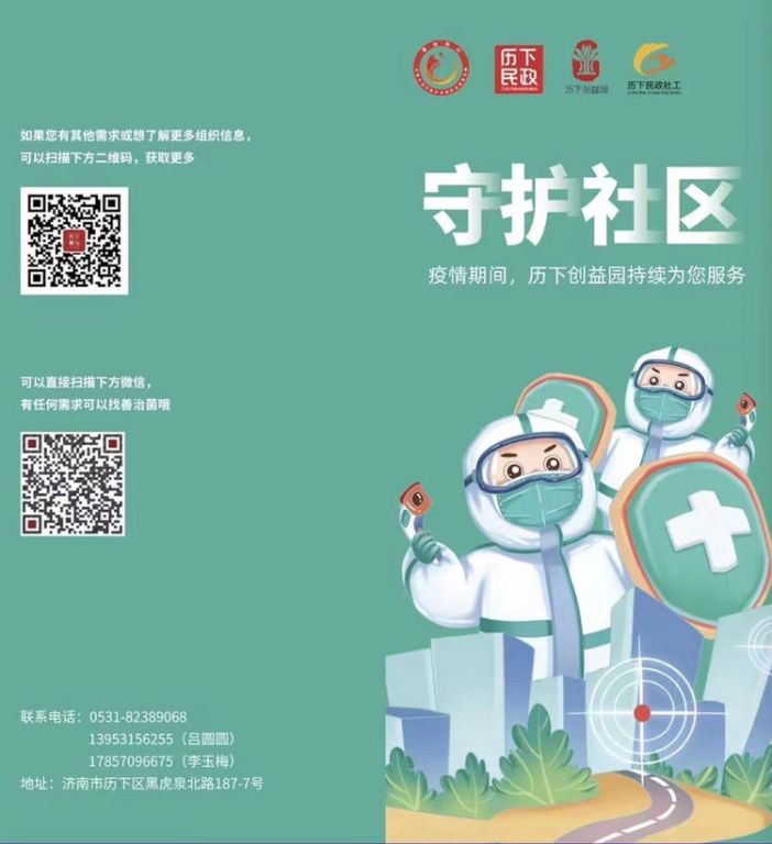 为有效阻断疫情传播,尽快实现“动态清零”,社区防控作为疫情防控的第一道防线,也是各项防控措施落实的最基本的单元,被摆在了重要的优先位置。疫情之下,部分社区面临封控,除了要满足大部分社区居民、酒店住户的基本需求,社区内独居、失能老人、孕产妇、残疾人等特殊群体的特殊需求更需要得到有效和及时回应。2022年5月7日,大明湖街道社工站开展“疫情之下 守护社区”历下公益服务进社区走访宣传活动,将历下区民政局、历下创益园、历下善治印发的《守护社区,疫情期间历下创益园持续为您服务》宣传折页送至六个社区,并进行讲解宣传。面向社区中的心智障碍者、孕妇、癌症家庭、罕见病家庭、失智老人等弱势群体,历下创益园的社会组织充分发挥自身组织优势和专业优势,开启“线上抗疫”模式开展精细化、专业化服务。
