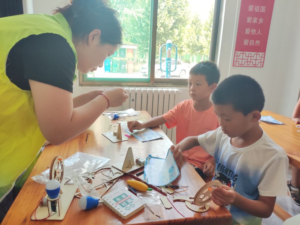 社工将已经完成的作品给大家演示,旋转大滚轮的手柄,带动马达反向旋转,在外力的带动下线圈在磁场当中作切割磁感线运动产生感应电动势,由此点亮灯泡。小朋友们无不惊讶科学的神奇之处,自己也动手进行组装,活动中,社工手把手帮助小朋友将零件仔细地拼装起来,从连接电线、固定螺丝到组装完成都非常考验孩子们的耐心和细心。“老师、老师,这个怎么装?”稚嫩的声音此起彼伏,孩子们在社工与志愿者的帮助下完成了木板的拼接、电线的连接以及最终的发电测试,参与活动的孩子们们亲手完成一个又一个步骤,体会到了动手制作的乐趣,感受到了科学的魅力。