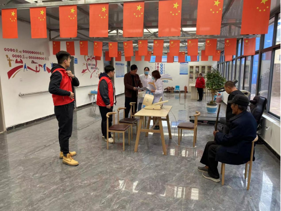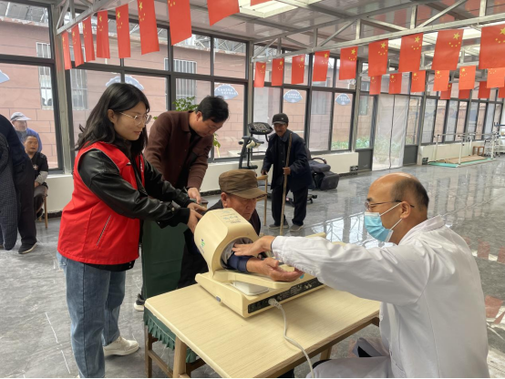体检现场,社工及志愿者维持秩序,引导老人们根据体检表上的项目,依次进行血压、血糖、健康量表等项目检查,医生认真详细地检查老人们的身体,针对老年人常见的饮食规律、慢性疾病和部分老年人以往所患疾病、治疗、用药情况,社工们根据健康评估进行登记,收集大家的信息,为后续跟进服务提供有效信息,在体检过程中,社工们耐心为村居高龄老人解读医生的嘱咐,叮嘱他们要合理膳食、适量运动,保持自身健康。
