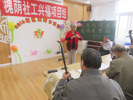 活动开始前,项目组社工与社区居民进行了简单的互动,表达了对社区居民重阳节的祝福,活跃了现场气氛。在项目组社工的带领下,重阳节庆祝活动正式开始,20余名社区居民精心准备的节目依次上场。在优美的二胡声中,在动听的吕剧中,在欢快的歌声中,社区居民静心观赏着台上精彩的一幕幕。整个活动现场高潮迭起,喝彩不断,现场气氛非常活跃,社区居民多才多艺,丰富多彩的节目表演让每位居民的脸上都洋溢着开心幸福的笑容。