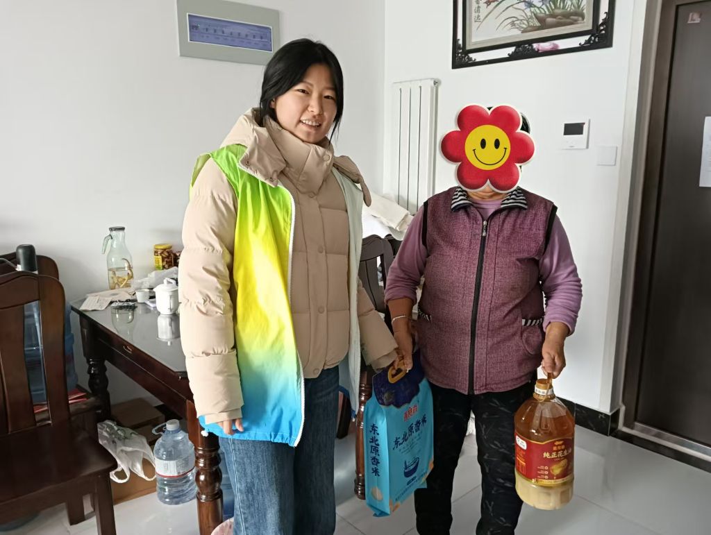 首先来到了村民李大爷家。李大娘因腿部残疾行动极为不便,生活起居多有困难。当工作人员们带着新春物资走进他家时,李大娘正坐在老旧的椅子上休息。看到大家的到来,他眼中满是惊喜。社工快步上前握住李大娘的手,亲切地说:“李大娘,快过年啦,我们来看您,给您送点年货!”说着,将米和油放置妥当。随后,大家围坐在李大娘身边,仔细询问她最近的身体状况,生活上有没有什么困难。李大娘感动地说:“我这腿脚不好,平日里多亏了你们挂念,这过年的东西都给我送来了,太感谢了!”