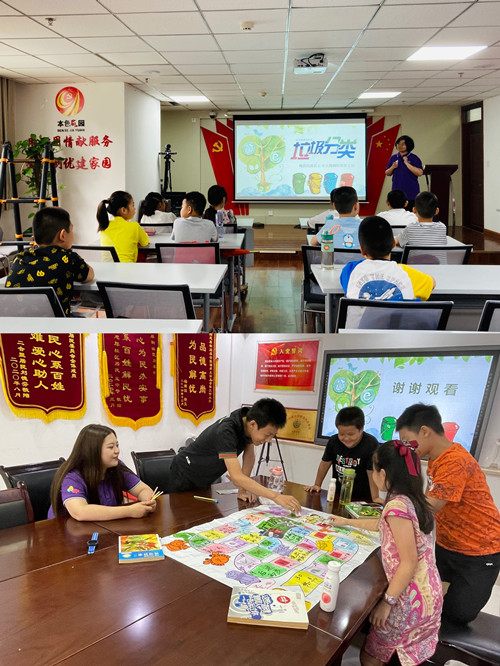 彩虹童年夏令营已经走进了尾声,在前三周的主题活动中,青少年的综合素质和公益精神都得到了提高,现在已进入践行志愿服务阶段。为进一步使垃圾分类深入人心,践行垃圾分类志愿服务,影响带动身边人分类投放垃圾,中大槐树街道社工站以主题活动周的形式,开展以“垃圾分类连连看”为主题的志愿成长周活动。