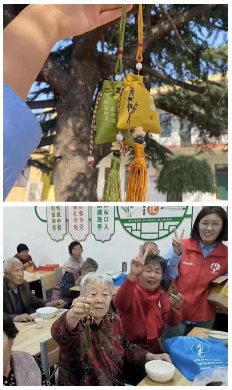 饭后三名社工为老人送上满载祝福与关爱的茱萸香囊,一边发放一边讲解重阳节茱萸香囊的文化、起源及用途。“茱萸香味真好闻,我要带回家去挂起来。”“是的,闻着挺香,一下就神清气爽了。”老人们开心的举起香囊,与社工合影,相机定格美好瞬间,记录这一刻的温情。