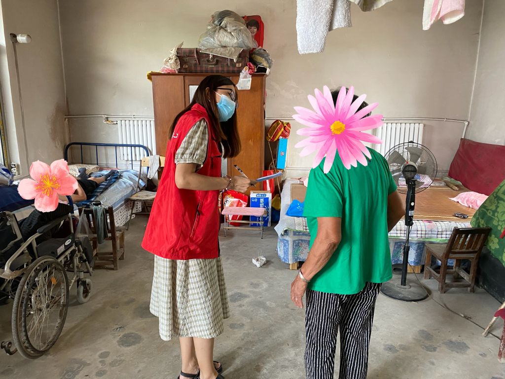 访民情,送关怀。一早,社工来到王沙村王某芹家中,映入眼帘的是破旧的房屋,简陋的家具。房间里一位年过七旬的老人正在给卧床的儿子擦拭身体。我们走到老人面前,听见她的呼吸有些急促,看见她额头上的汗珠流淌下来,老人用手臂轻轻擦去脸颊的汗,连忙跟我们打招呼,社工与老人细致的沟通交流,了解他们近期的基本生活情况以及面临的困难。经过了解得知王某芹和母亲相依为命,没有其他家庭成员。王某芹为多重四级残疾,前段时间又因为意外导致双腿失去知觉,失去了自理能力,靠母亲照顾,家庭生活困难。