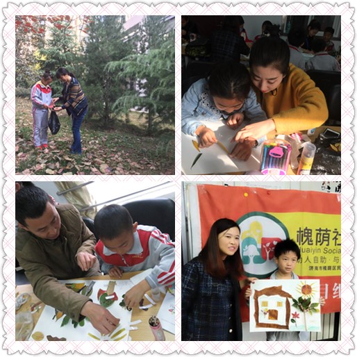 为促进亲子良性互动,增强亲子彼此理解与交流。11月3日,项目组联合饮马小学三年级八班家委会,于兴福街道综合文化站为班级内11对亲子开展了一次互动小组活动。本次活动分为“心中的家”“寻找落叶”“创作家园”“家的分享”四个环节,在社工与大家相互认识后,便引入了本次活动主题“我爱我家”,大家对“我心目中的家”做了相互的交流。接着社工带领家长和孩子们去社区内寻找落叶,为接下来的树叶贴画做准备。“创作家园”的过程中,家长和孩子们通过相互沟通交流用树叶把心目中的家勾勒在了纸上。最后大家对创作的作品进行了分享,有具象的物质展示、意象的人物形容,都在传达着温馨、幸福、团圆。