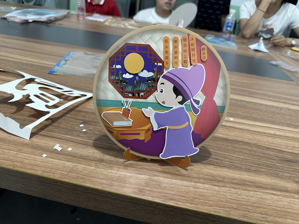小手工,大内涵。随后,社工为孩子们发放diy古诗词的材料,讲解制作的流程与细节及摆放的技巧,同时鼓励孩子们发挥各自的聪明才智,精心构思,作出精美的手工作品。经过社工与志愿者的指导,不一会,完美的成品就展现在大家面前。