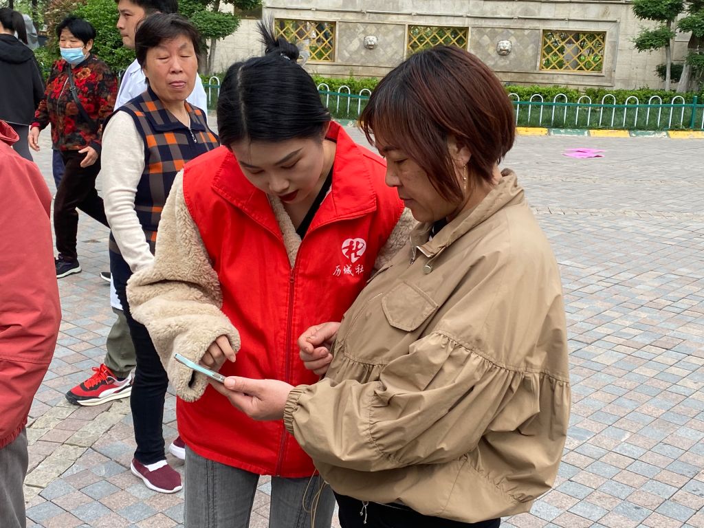 社工及社区志愿者在现场引导居民排队、登记信息。随后,志愿者向辖区居民发放宣传单页,呼吁居民要保持健康心态,劳逸结合,出行注意防护,引导居民养成良好的生活习惯。