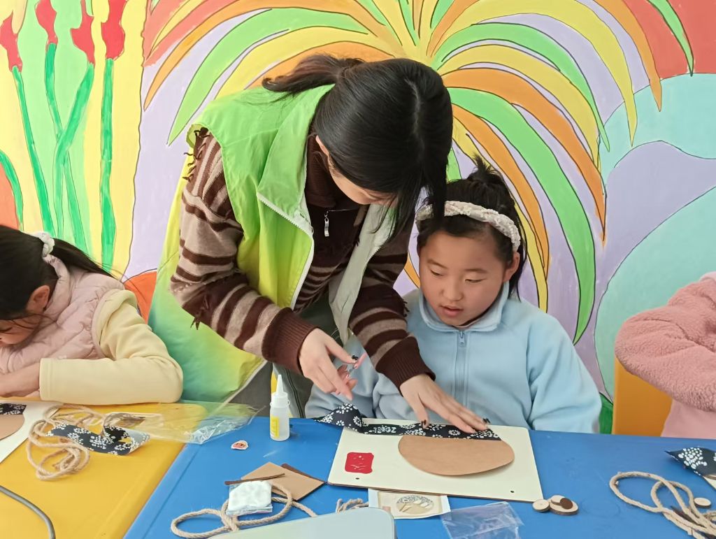 随后,社工为孩子们提供了冬至原木画材料包。社工讲解完制作步骤后,孩子们就迫不及待地动手操作啦。他们专注地在原木片上缠绕麻绳、粘贴图画,精心制作出一幅幅富有创意的冬至主题画作,有可爱的、圆滚滚的饺子,也有一圈又一圈的年轮,无不象征着冬至的到来。在制作过程中,孩子们相互交流、互相帮助,现场充满了欢声笑语。