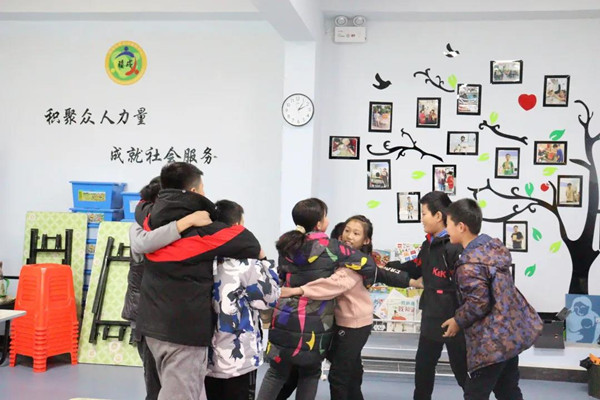 在活动开始之前,社工带领儿童进行破冰游戏——桃花朵朵开。“桃花朵朵开”,“开几朵”,很快活动室里充满了孩子们的欢声笑语。