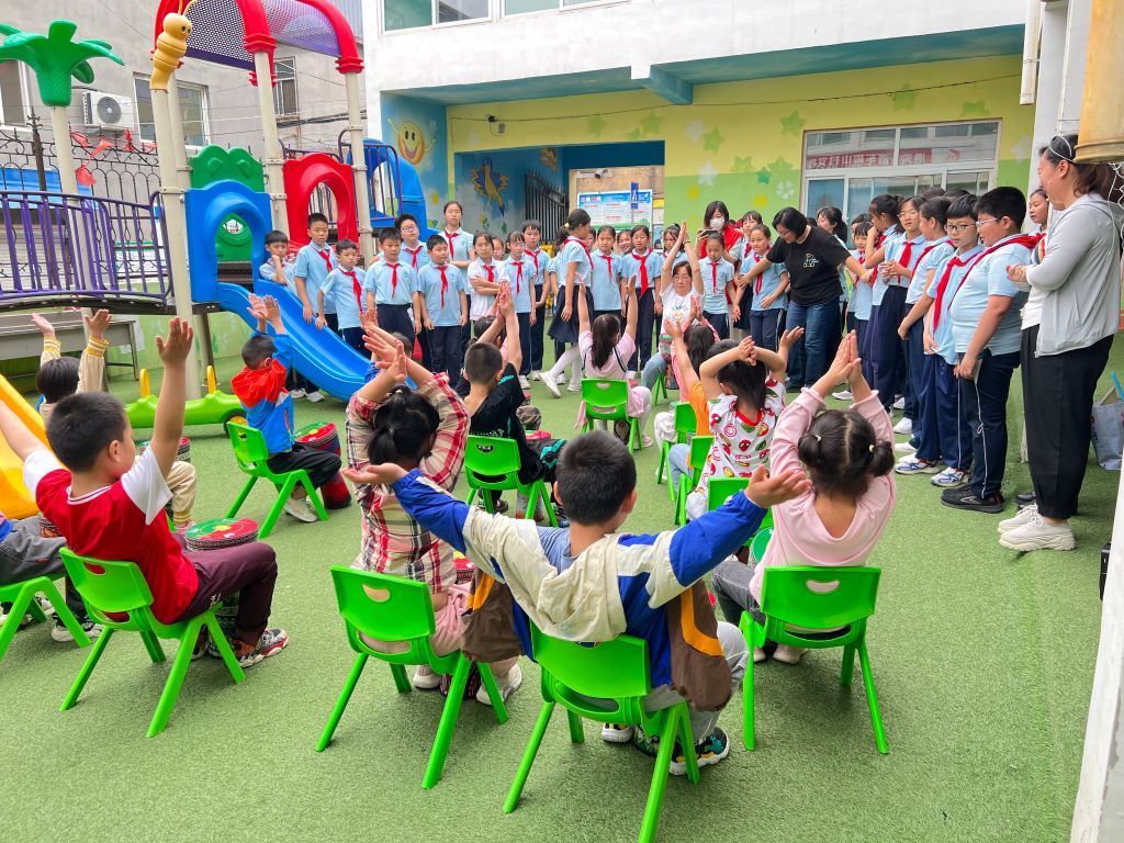 活动开展前期,社工站积极对接社区及辖区幼儿园,为活动的开展做好充分的准备。山东师大二附中小学部的小小志愿者带着自己手绘的T恤、捐赠的书籍、以及笔记本等学习用品,为车脚山幼儿园的孩子们送去满满的祝福。同时,幼儿园的小朋友以手鼓舞表演来表达对哥哥姐姐的感谢。小小的活动不仅承载着孩子与孩子之间的情感交流,更是一种别样的互助成长的体现。
