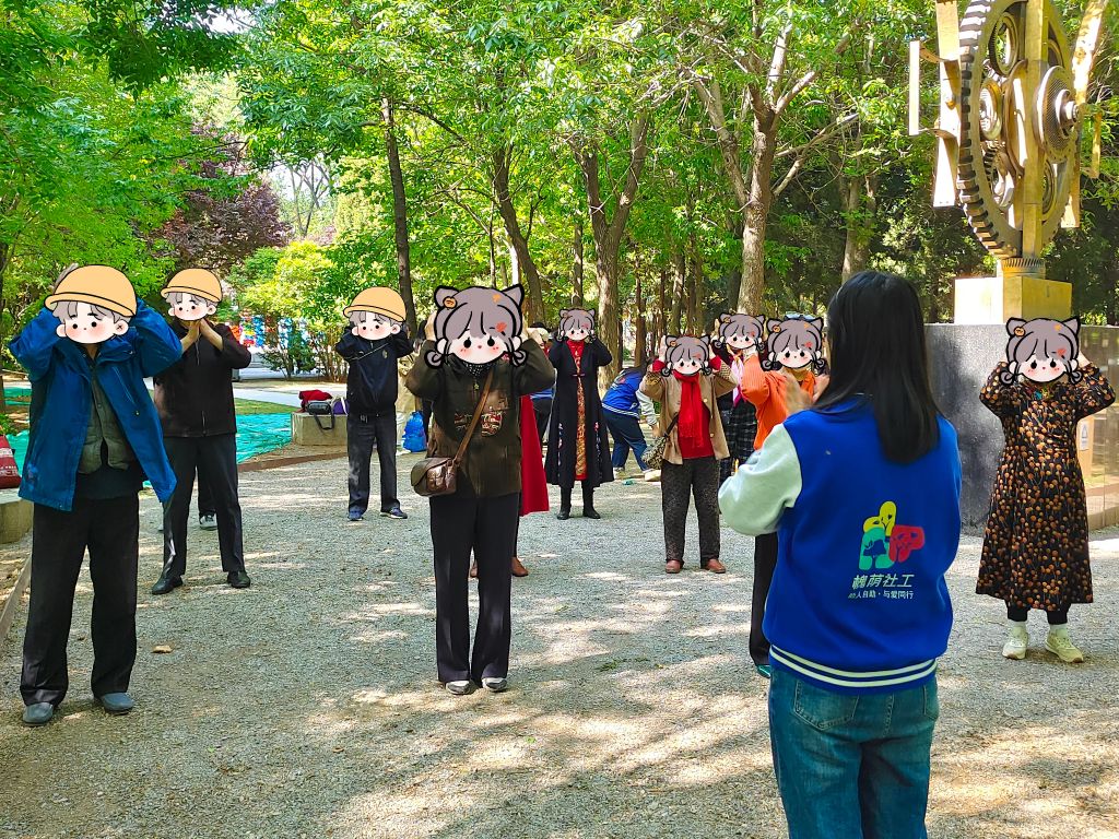 人随春好,春与人宜。小组成员到达集合地点后,社工给成员分发了签到表和安全协议,小组成员仔细阅读后并进行了填写。随后小组成员在社工的带领下,到达了公园内的活动地点。在介绍完本次活动的内容、流程之后,社工便带领小组成员练习“拍拍操”。“头头拍拍,肩肩拍拍……”跟着社工的节奏成员们也集体动了起来,更有成员毛遂自荐主动带领大家进行练习,玩的不亦乐乎。通过这一环节成员们既锻炼了身体,又联络了成员之间的感情。