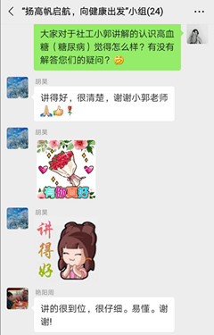 在整个高血糖健康小组的互动过程中,社工利用自身的专业优势,查阅相关专业知识文献,解答了小组成员对高血糖方面的疑惑;分享了控制血糖的方法技巧,小组成员更加全面的认识高血糖;解决了小组成员对高血糖相关知识的错解,科学健康的预防、控制血糖,满足了对健康养护的需求。