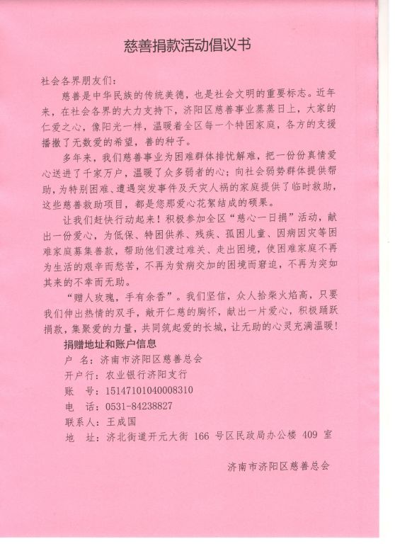 近日,济阳区慈善总会收到一笔来自曲堤街道李女士的个人捐款。曲堤街道社工站经过调查得知是一位低保户家庭刚毕业的女孩把自己第一个月的工资捐献出来回报社会。