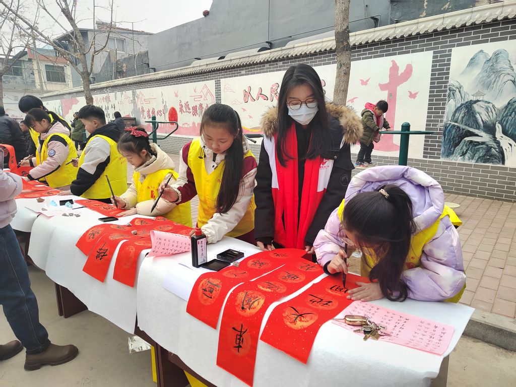 而在广场的另一边,归德街道社工站链接逸飞书画的小朋友为大家写福送对联。虽然他们年纪尚小,书法技巧还稍显稚嫩,但每一笔每一划都写得认真专注,充满了对新年的憧憬和对传统文化的敬意。社工们将这些饱含祝福的福字对联送给村民,村民们纷纷夸赞孩子们的心灵手巧。