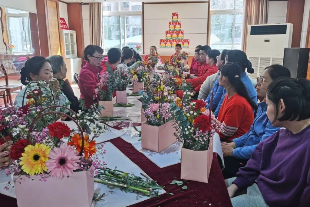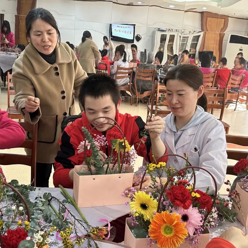 初春的济南,生机盎然,万象更新,3月7日下午,在市社会福利院一楼活动室里,一场别开生面的花艺培训活动正在热闹地开展,现场气氛热烈,花香四溢,来自各服务区的二十余位大龄残疾青年、老人和部分党员志愿者一起,学习花艺设计和制作,感受诗情“花”意般的生活仪式感。