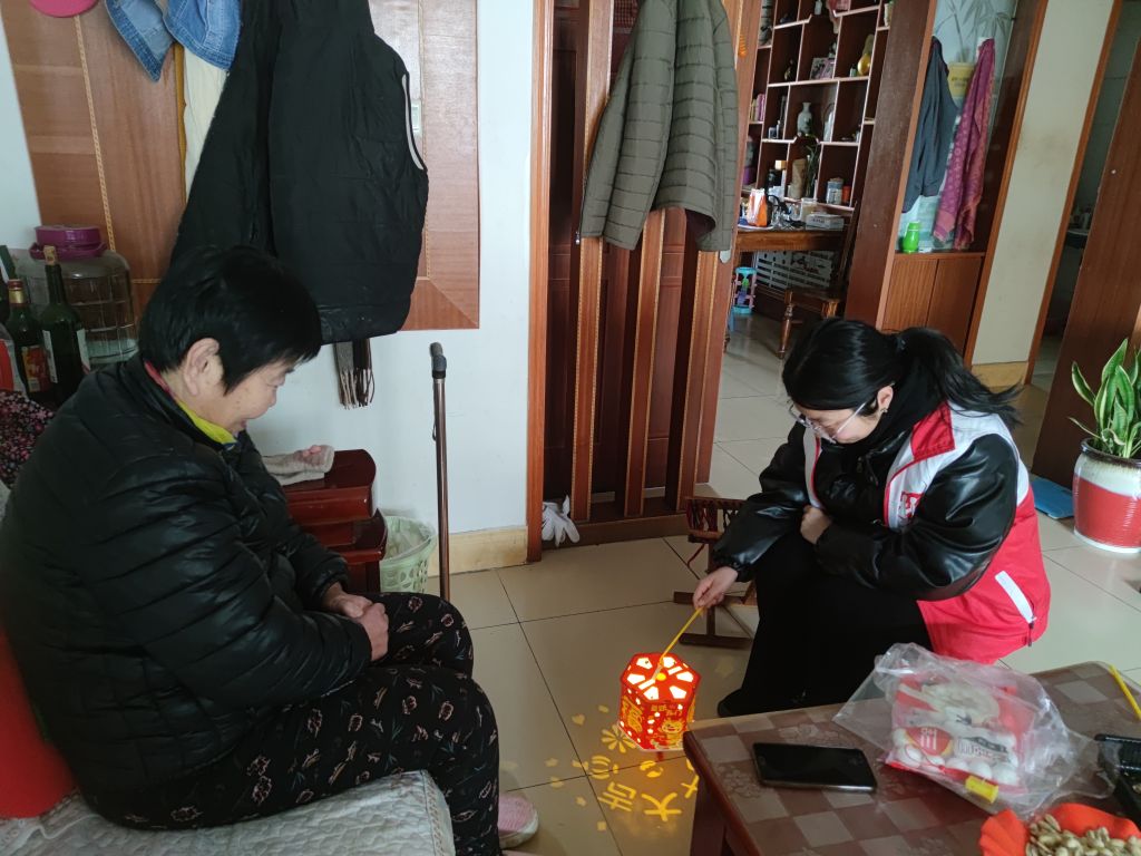 社工为王奶奶送去汤圆,并送上元宵节的祝福,同时社工还与王奶奶一起制作灯笼,社工手把手地示范灯笼的制作过程,王奶奶全神贯注地学习,拿着材料,按照步骤一步步开始制作。经过努力,象征着吉祥如的漂亮灯笼在王奶奶和社工的手中诞生了。看着自己亲手制作的灯笼,王奶奶的脸上洋溢着自豪和喜悦。