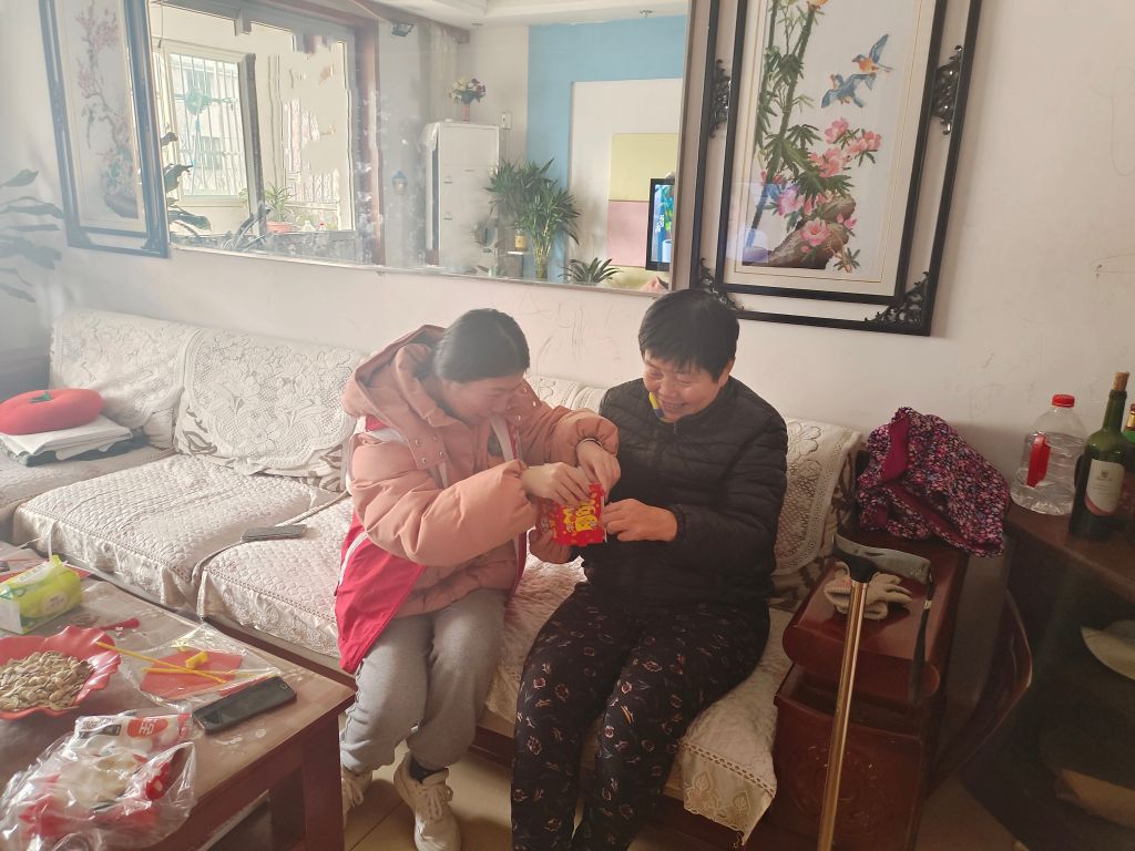 王奶奶,60岁,因生病导致身体有残疾,腿脚不便,加之住楼上,不好下楼,生活比较单调。活动中社工带着关怀与祝福,走进了王府社区,为王奶奶送去了温暖。社工与王奶奶亲切交谈,询问生活状况和身体状况,提醒王奶奶注意安全和保暖,倾听王奶奶的需求和心声,并送上精心准备的礼物,细心叮嘱着每一个细节,希望能够度过一个平安、快乐的节日。王奶奶表示:“我腿脚不好,下不了楼,整天在家里,也没什么事可干,总是有点无聊,你们来陪我聊聊天就让我很开心了”。