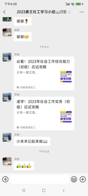 下一步,唐王街道社工站将根据小组要求,邀请近两年考过的小伙伴分享学习心得,帮助小组成员梳理学习思路,掌握考试大纲内容和主要考点,后期通过线上和线下相结合的学习方式,为小组成员提供学习计划、答疑解惑、考点精炼和线上刷题等考前学习服务,也会鼓励组员及时分享考点知识和考试技巧,争取全员上岸!