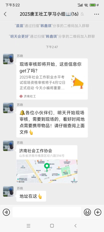 信息发布不久就得到大家的积极响应,有意向的小伙伴陆续进群,不断有新进的成员咨询社会工作者报考相关信息和注意事项,社工就相关问题进行一一解答,并及时转发济南社工发布的报考流程和现场资格审查文件信息,为小组成员提供最新的报考资料。