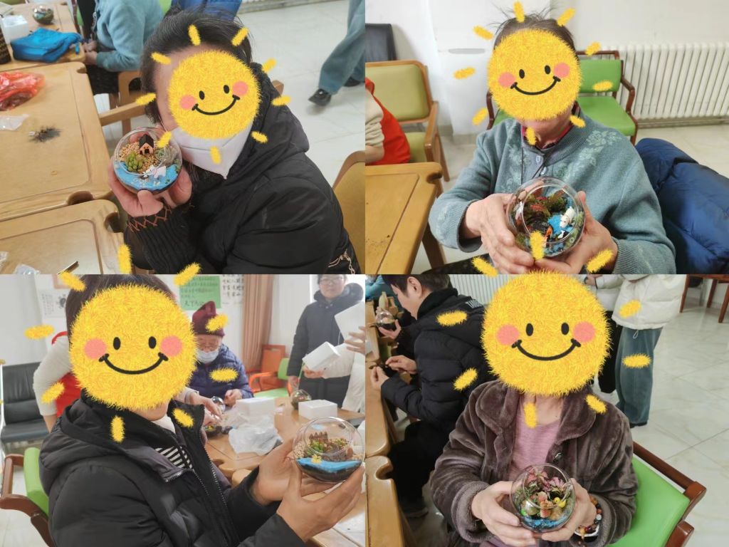 在一片欢声笑语中,一幅幅微缩景观,一个个妙趣横生的小世界,逐渐呈现了出来。方寸之间,尽显浓浓春意;巧手之下,满是勃勃生机。大家看着自己亲自设计的作品,喜笑颜开、爱不释手。活动最后,社工为大家送去了节日祝福,一位奶奶对社工说:“我眼睛看不清,平时不咋参加活动,但这个活动挺好,我能用手摸着满满完成,回家后我就摆到阳台上,谢谢你们哈!”