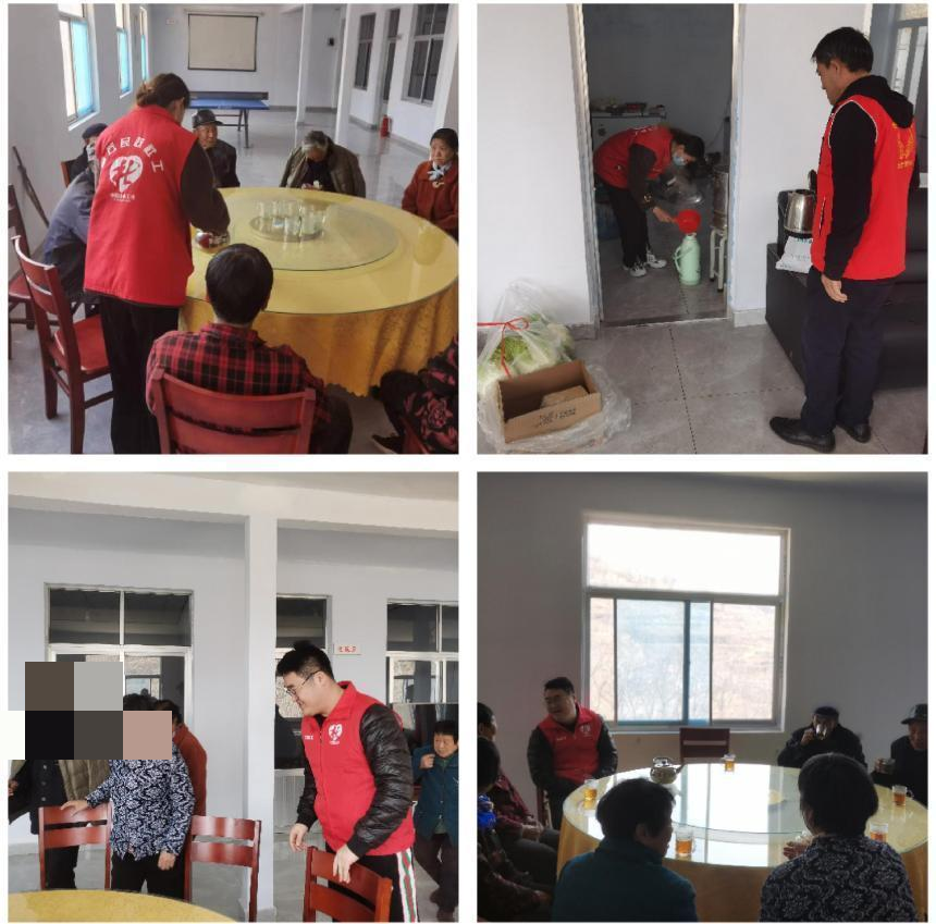 到达目的地之后,我们先向村书记了解本村的基本情况,村里共计200余人,而且老年人偏多,由于条件有限所以今天的助餐活动主要是满70周岁以上的老人助餐。村书记向我们说:“你们能来真是太好了,帮大忙了,平时我们三人压根忙不过来。”十一点半左右老人们纷纷到达幸福院,他们坐在一起聊天,满脸洋溢着笑容,很是开心。志愿者帮老人们倒上已经沏好的茶水,一名社工坐下来倾听他们诉说着自己的过往,另一名社工在厨房帮忙准备着今天有着“幸福味道”的午餐,一切都秩序井然。