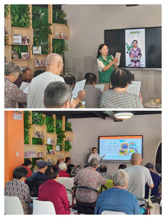 随着活动的深入,省立三院的高级社工师张玉引导老人们进入益智健脑卡朗读环节,这一环节不仅活跃了思维,更为接下来的知识讲座做好了铺垫。紧接着,荆美林老师以“糖尿病人怎么吃?”为引子,深入浅出地讲解了如何选择适合的主食、蔬菜、蛋白质及油脂,运用生动形象的瓶盖、小勺等比喻,让复杂的营养摄入概念变得直观易懂。特别是“盘子法则”的引入,让老人们直观地感受到了餐盘中各类营养物质的合理搭配比例,为他们提供了实用的饮食指导。