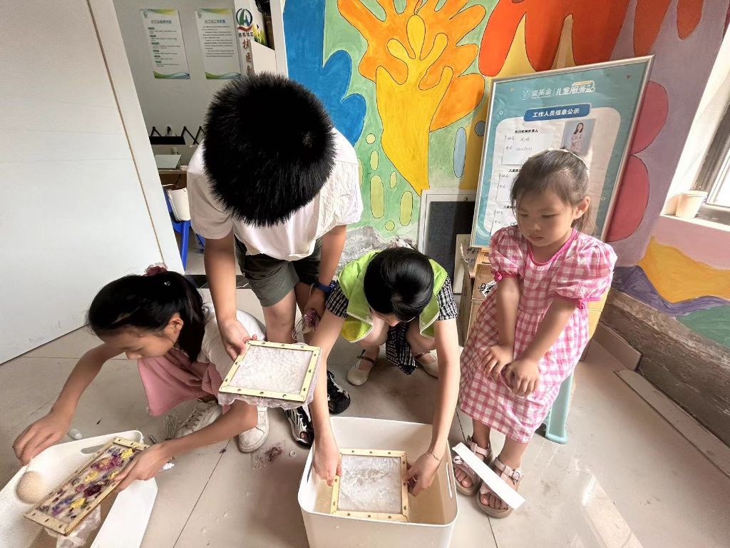山东聊城是鲁庄造纸技艺的起源地。据《汉书》记载,东汉元兴元年(105年),宦官蔡伦在谷城(今阳谷城)传授造纸技术,后人称鲁庄纸为“蔡伦纸”“谷纸”。为让孩子们深刻地体会这一技术的魅力,社工专门准备了造纸术所需要的材料,并耐心地向孩子们展示了造纸的操作技巧,并鼓励他们亲自动手尝试。孩子们围坐在一起,小心翼翼地将纸浆铺平,用竹帘轻轻摇晃,每一步都显得格外认真。当一张张粗糙的纸张在他们手中逐渐成型时,他们的脸上洋溢着成就感和自豪。浩浩兴奋地向同伴展示自己的作品:“看,这是我做的纸,我要用它来写信给远方的爷爷!”