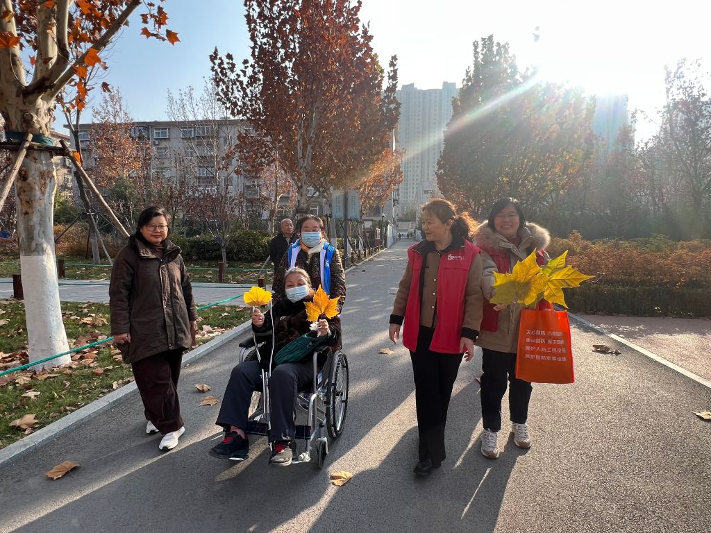 段店北路街道社工站所在的财富壹号花园社区里有一位热心的志愿者阿姨姓樊,每一次志愿活动都有樊阿姨忙前忙后的身影,然而就在上个月,樊阿姨不小心把脚扭伤了,不仅社区活动参加不了,连下楼都很困难,志愿服务队的伙伴们时间长了也都很想念她。正值“12.5”国际志愿者日,天气又好,社工和志愿者们借了一个轮椅,来到樊阿姨家,推着她一起去花圃公园散散心。和伙伴们说说笑笑间,扭伤脚的阴霾心情也如乌云散去。