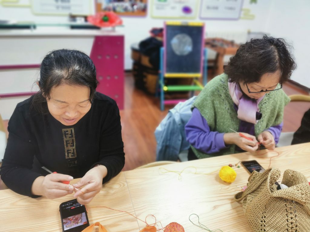 活动伊始,社工带领组员们进行破冰游戏,通过分享编织知识和建立微信群,让阿姨们逐渐熟悉起来;随后,社工站邀请擅长手工制作的高阿姨,带领大家一起学习编织,并为组员们准备了丰富的编织材料和工具,确保她们能够充分学习编织手艺。