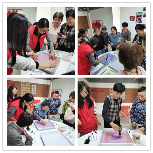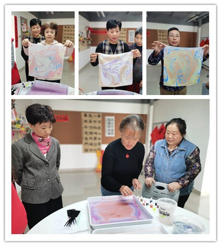 在体验制作过程中,老人们纷纷化身艺术家。他们小心地调配颜料,专注地观察颜料在水面上的扩散与融合,那认真的模样仿佛在雕琢一件稀世珍宝。有的老人凭借着丰富的想象力,创作出精美的花朵与灵动的飞鸟;有的则相互协作,共同完成一幅作品,现场气氛热烈而和谐。