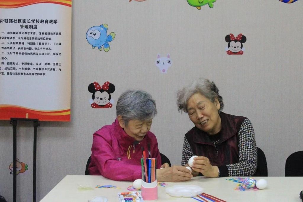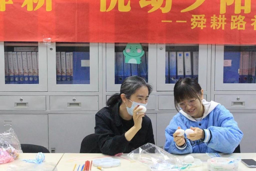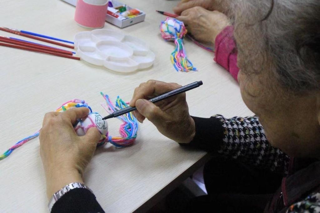 活动的第一环节是编蛋套与装饰鸡蛋同步进行的,居民可以自由选择编蛋套或者是装饰鸡蛋,活动现场大家可以自己选择要参与哪一个。在现场,大家都能够找到自己想要参加的活动。志愿者首先拿出准备好的材料,参与演示了如何进行蛋套的编制,在演示的过程中大家都认真地学习了编制蛋套的方法,就算有些并不明确的步骤也有现场工作人员进行指导。