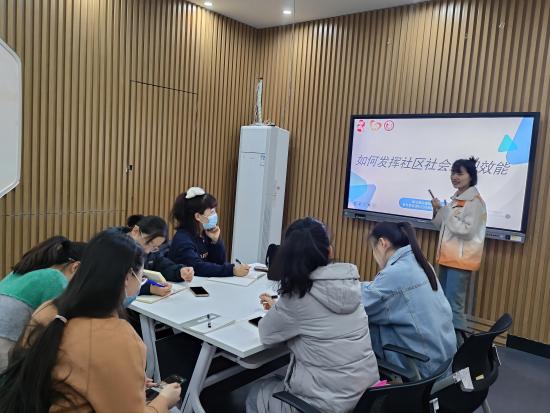 本次培训以小组工作坊的形式进行,站长李舒为小组成员带来了一场以“如何发挥社区社会组织效能”为主题的互动培训。社工从社区需求调研以及社区资源导向为视角,以案例分享以及经验传授的方式,提升社区工作人员的社区动员与组织能力,协助社区为居民提供个性化、多样化服务,充分发挥社区社会组织服务作用,发挥其扎根社区、贴近群众的优势,广泛动员居民参与志愿活动,提升长效开展社区服务的能力。