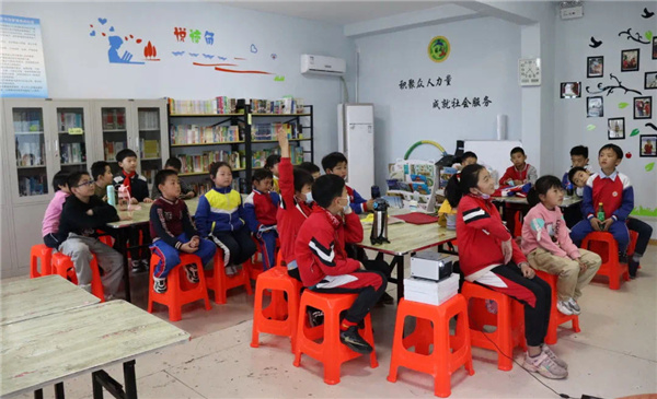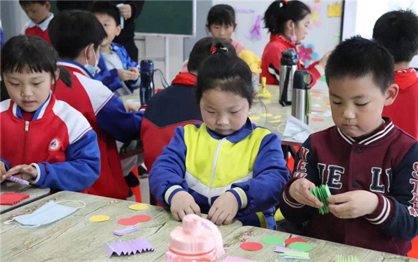 之后社工发布了今天的第一个任务——制作手工劳动奖章。三位社工将裁剪好的彩纸发给小朋友,小朋友们争先恐后的选取自己喜欢的颜色。在社工讲解劳动奖章制作步骤的过程中,小朋友们也跟着粘贴、装饰自己的劳动奖章。有些小朋友理解能力强,很快就做好了两个,高兴地向社工老师展示;有些小朋友则进度较慢,卡在了几个关键步骤上面,心里很是着急、受挫,社工一方面鼓励他们,耐心细心进行操作,另一方面引导做得快的小朋友帮助进度稍慢一些的小朋友。