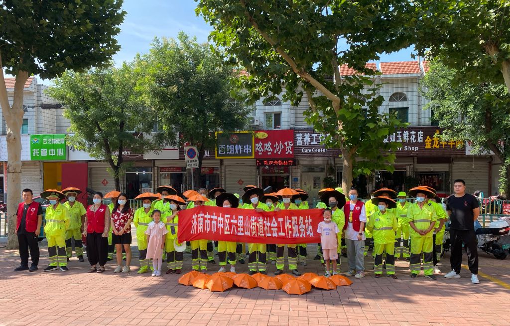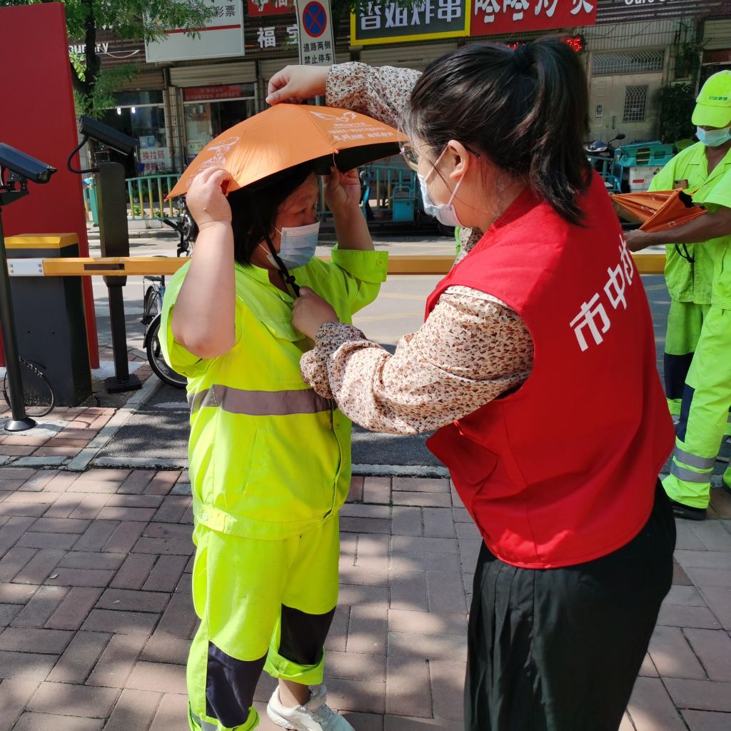 7月25日上午,六里山街道社工站在党群服务中心广场为辖区50名环卫工人送去定制的爱心伞,为他们送去清凉。爱心伞是社工站链接的泉城公益小天使项目资源,是一种定制的头戴式遮阳伞,一个个桔黄色的爱心伞像一朵朵格外暖的云朵,为环卫工人遮挡烈日。