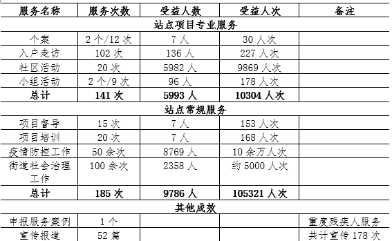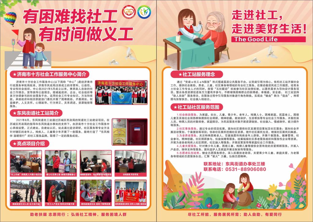 2022年,东风街道社工站在历城区民政局的指导和东风街道办事处的支持下,在历城区社工总站的督导下,顺利完成了东风街道社工站本年度的工作任务,同时也完善了社工站各方面的建设,在行政管理、服务执行和产出、社会评价等各方面都取得了阶段性的进展,社工服务也开始走进居民生活,站点建设向着居民可以“有事情找社工,有时间做义工”的目标发展。