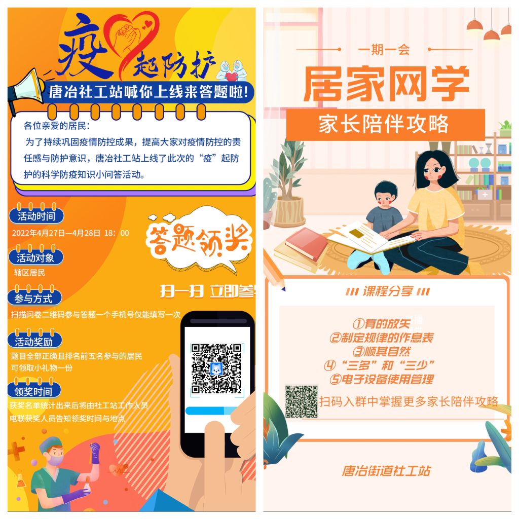 在参与全面的抗疫一线工作的同时,社工一直心系居民,辖区青少年停课居家网学,部分社区进行行封控管理,社工及时关注居民情绪,针对不同群体开展多元线上服务,助力居民共同度过这一特殊时期。