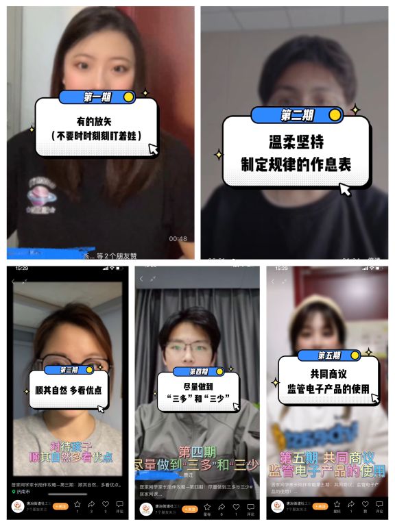 居家网学期间,社工对家长需求和问题进行评估分析,并根据中小学学生的心理特征,以平等、尊重为基础,一是设计《有的放矢(不要时时刻刻盯着娃)》、《温柔坚持,制定规律的作息表》、《对待孩子“顺其自然、多看优点”》、《尽量做到“三多”和“三少”》、《共同商议,监管电子产品的使用》五期亲职教育课程,并由红岛朗诵配音协会志愿者进行录制,通过唐冶街道社工站视频号进行宣传;二是建立“居家网学家长支持群”,社工群内积极引导沟通,让家长学会如何有效的处理网学期间亲子关系,学会在沟通中传达爱,拉近彼此的情感,家长们对该系列的陪伴攻略亲职教育课程评价颇高。