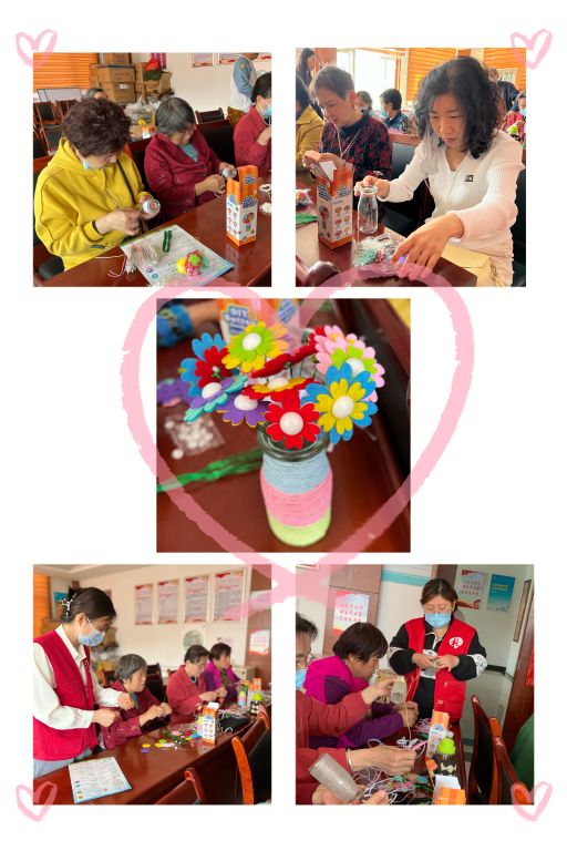 此次活动王官庄社工站特地准备了纽扣花束的DIY手工套装,操作简单,成品美观。活动开始前社工站人员向阿姨们表达了母亲节的祝福,详细讲解了花束的制作过程。首先为花束制作一个精美的花瓶,在玻璃瓶上粘上双面胶,在粘上色彩艳丽的绳子,一个漂亮的花瓶就完成了。每一朵小花都要精心制作,各种颜色花瓣、配上精美的扣子花心,用绿色的铁丝扎起来,一朵美丽的花朵儿就绽放了!