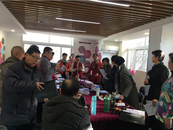 合唱团由社区歌唱爱好者组成,队员们伴着节奏反复磨合,从歌词到曲调,通过不断练习寻找问题、调整步调。合唱队的盛老师演示了准确性、统一性、平衡性及和谐性等基本技巧要领,讲解了声音位置和声音处理等基本理论常识。整个场面井然有序,参与队员热情高涨。