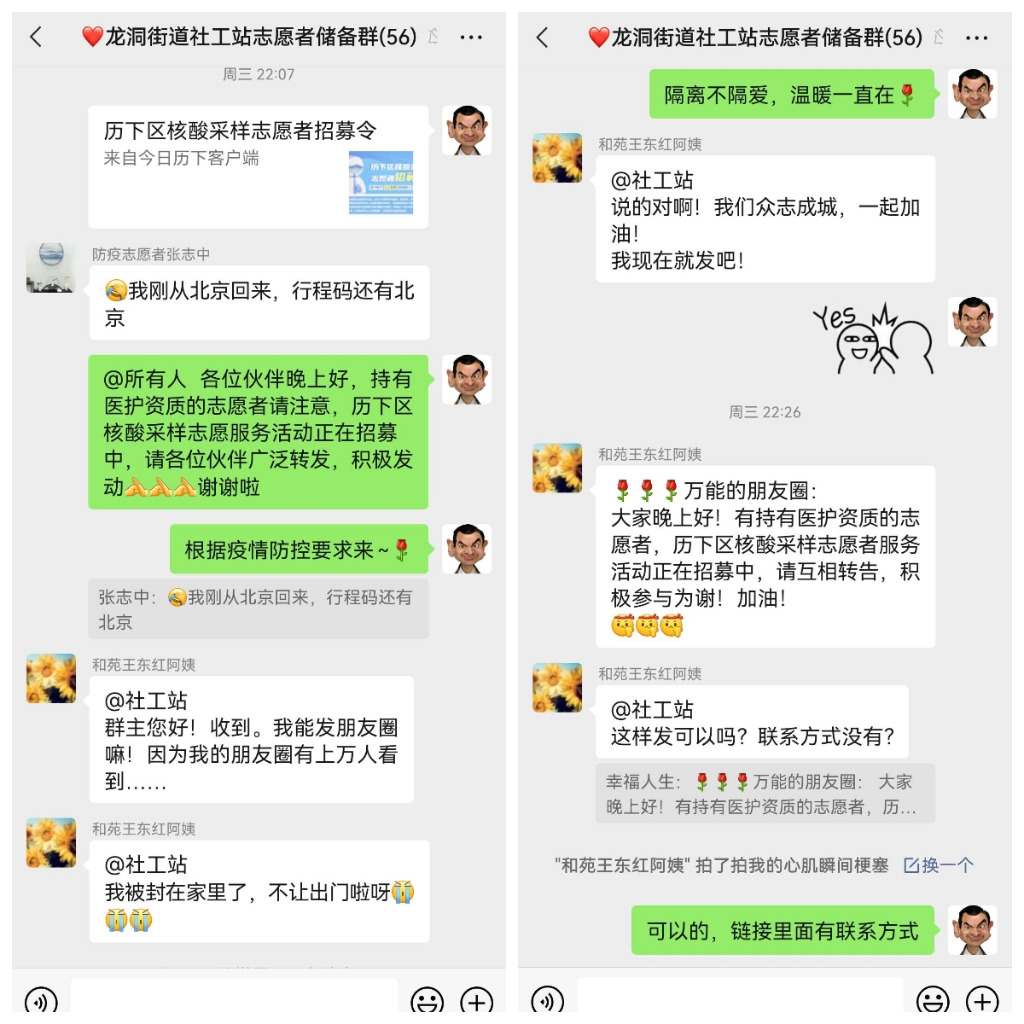 眼下疫情形势复杂严峻,社区防疫工作需要投入大量人力和精力。龙洞街道社工站响应疫情防控要求,积极转发志愿者招募信息,组建线上志愿者储备群,积极配合辖区各社区开展志愿者动员工作,目前正计划为新招募志愿者开展核酸检测点位的秩序维护、试管信息登记等工作的培训。翻开这几篇日记,这里记录的是发生在龙洞街道社工站的故事,在近期防疫工作中朴实无华、默默无闻的小事……