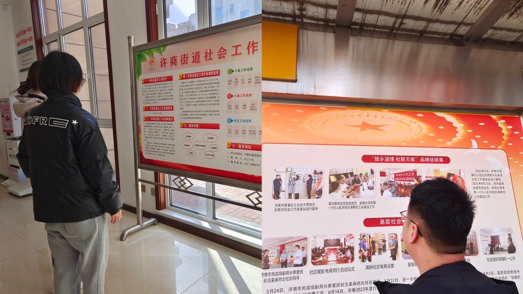 微光暖心田,舒心展笑颜。在许商街道社工站示范点及县民政局的展板上,一张张笑脸定格,向来往群众全方面展示了2023年全县社会工作建设成果及辖区内社工队伍风采,展现了商河县社会工作专业优势与发展成果。