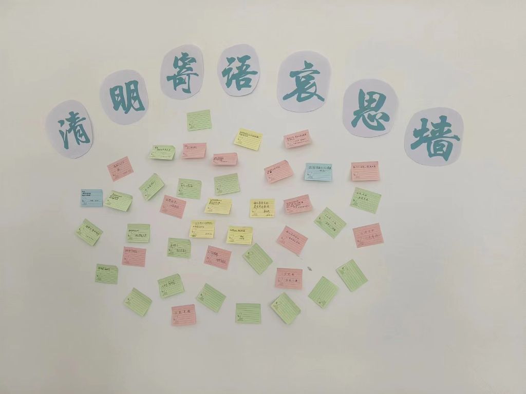 活动中,社工们充分利用宣传栏成立了寄语哀思墙,向社区居民介绍清明节有关的知识和民俗文化,组织社区居民将自己想对已故亲人的话写到哀思墙上,接着社工们发放宣传单页倡导社区居民用网上祭扫、家庭追思、献花等文明、环保、绿色的方式代替传统的习俗来表达自己对于逝去亲人的追思和缅怀。社工们还向辖区居民大力宣传文明节俭办丧事、国家殡葬管理相关法规、政策禁止的行为、以及殡葬惠民新政策、殡葬新风尚。